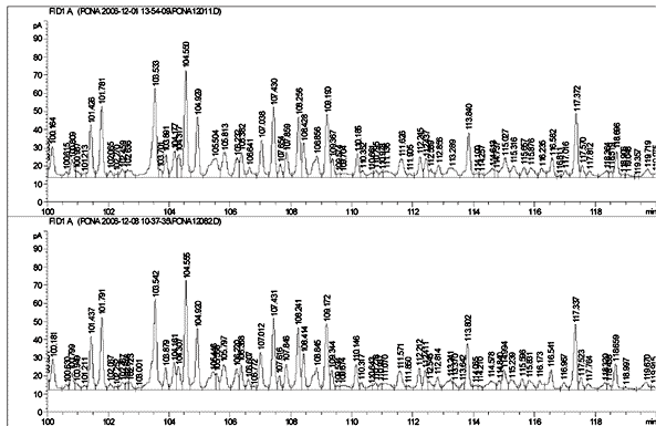 Among various software for ASTM D5134, a software called PONA developed by Beijing Chromtech Institute uses an algorithm of retention index to identify peaks. Because retention index is relatively insensitive to the variations from columns, instruments and methods, this software is able to automatically and correctly identify each peak with great confidence. Even though this algorithm improves accuracy of peak identification, it still requires minimum variations in column dimension, column retention time, column efficiency and column selectivity.
